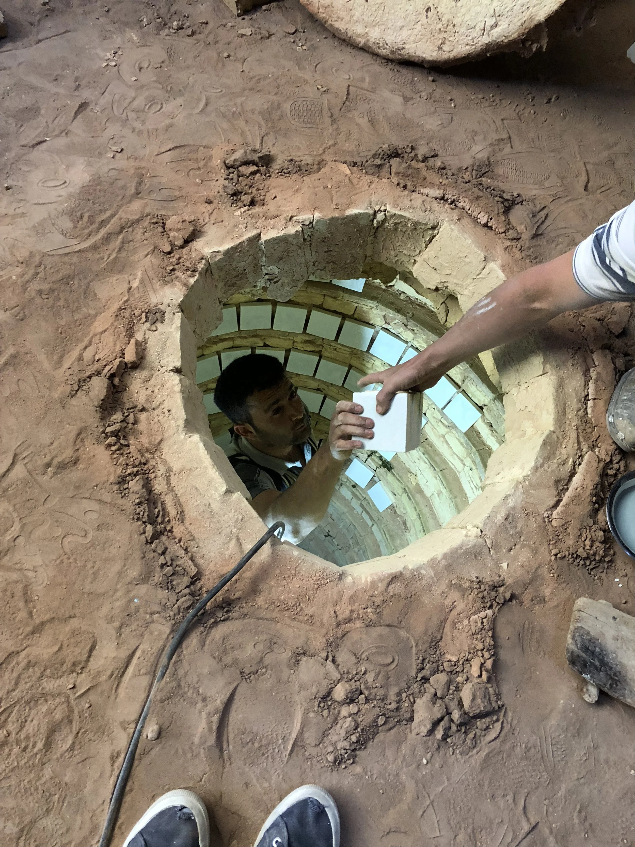 Person working inside a circular, brick-lined underground structure, handing a white object to someone outside.