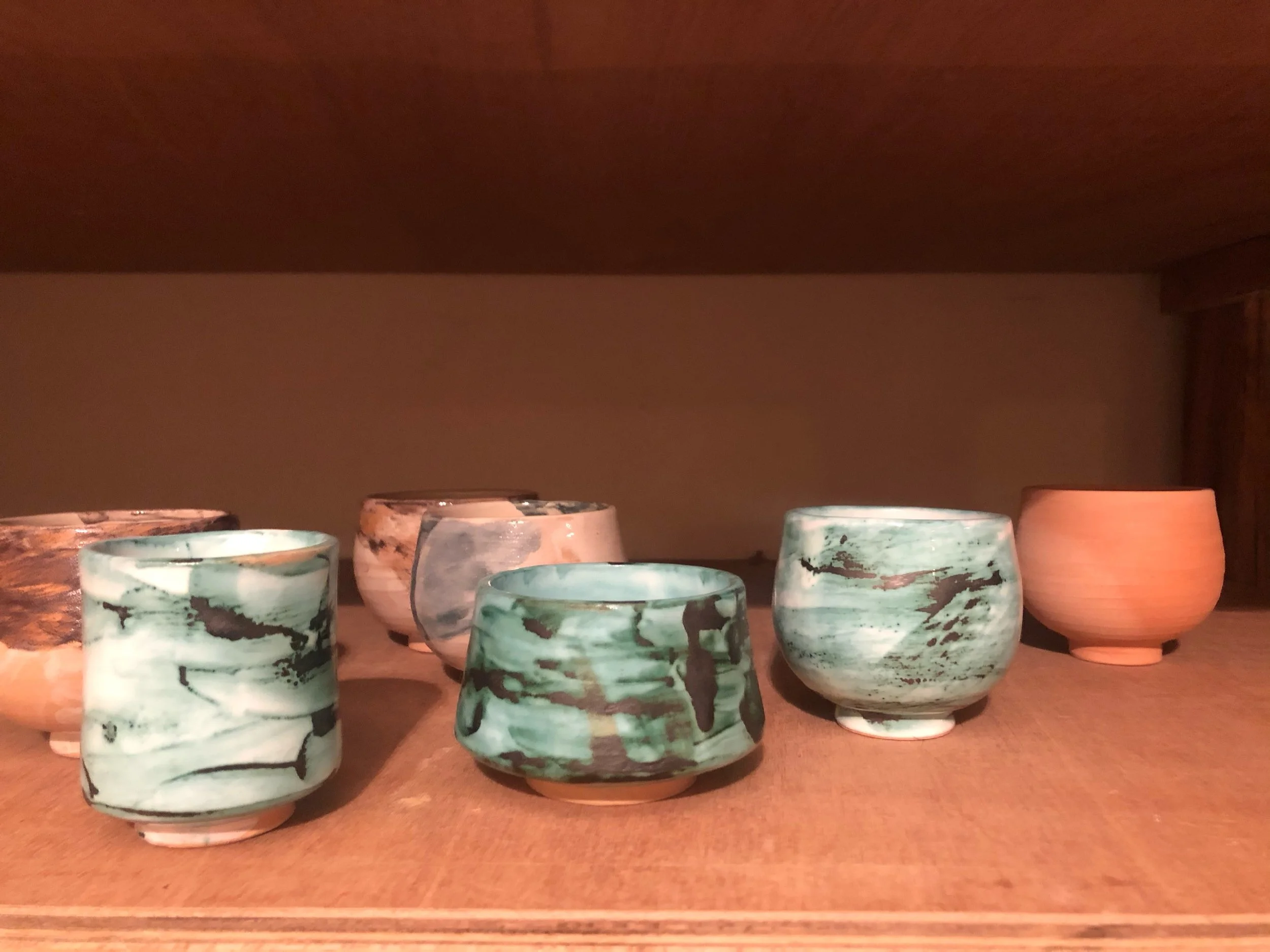 Assorted ceramic cups on a wooden shelf, featuring a mix of turquoise, marbled, and plain designs.