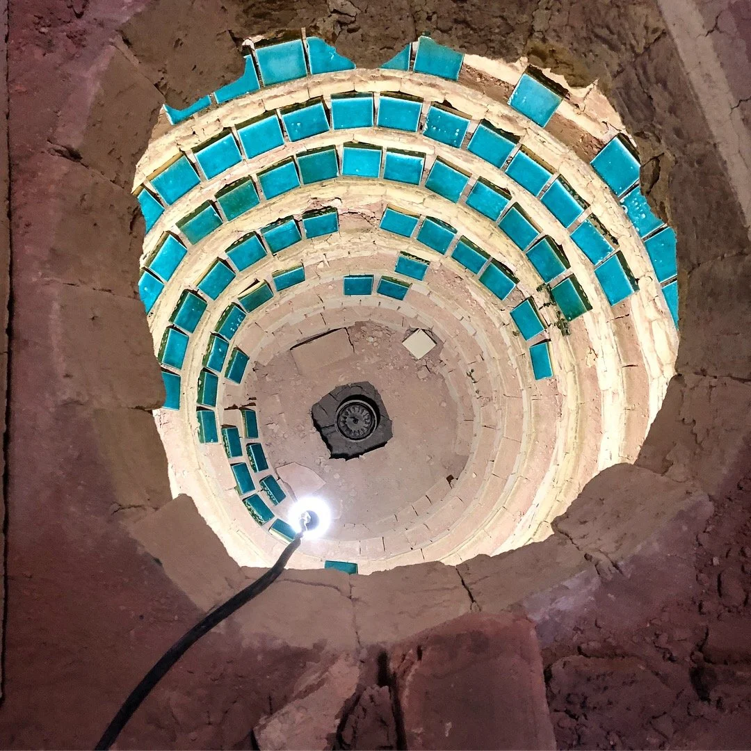 Inside view of a traditional clay kiln with circular layers of bricks and reflective tiles.