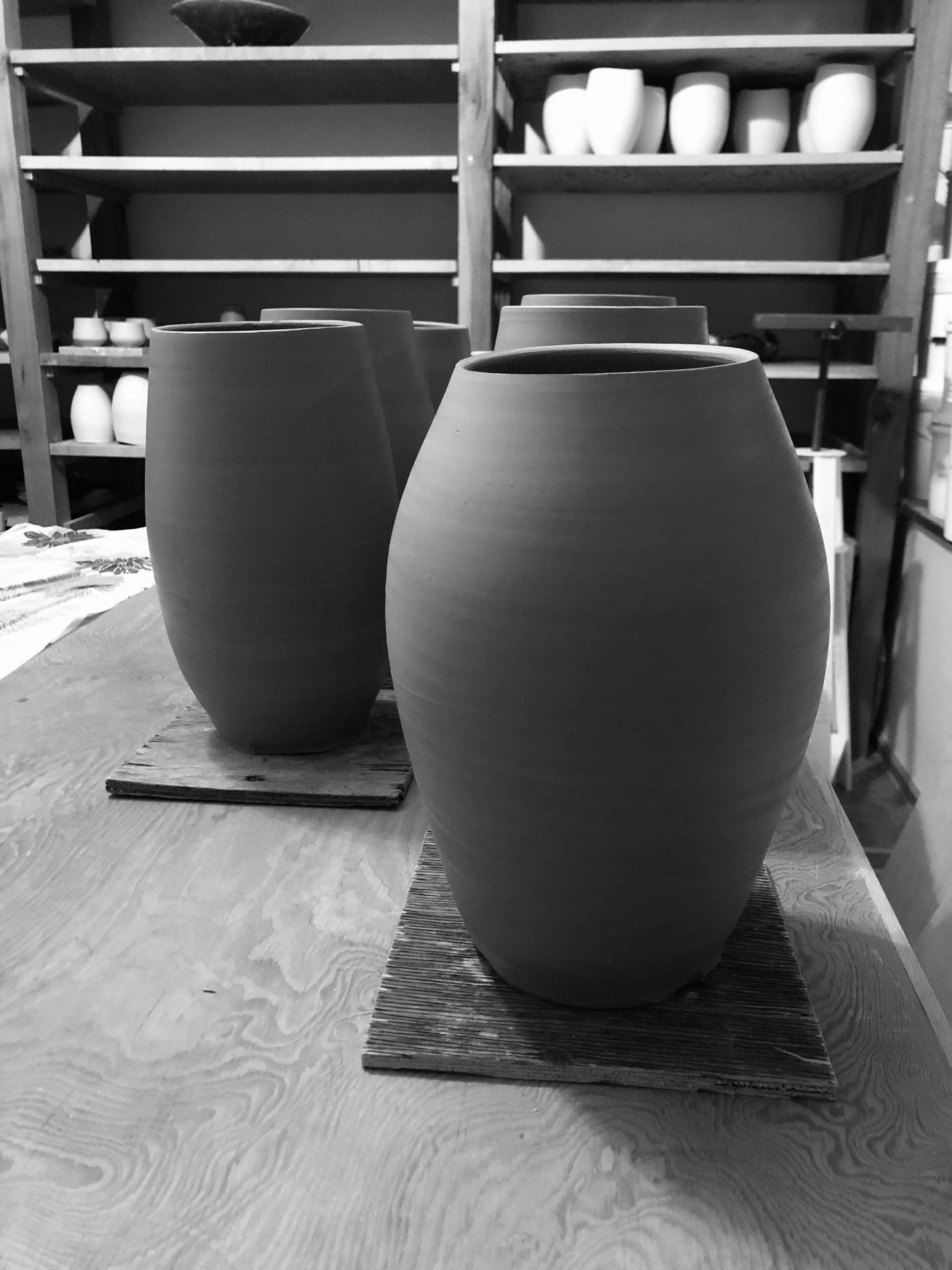 Black and white photo of clay pots on a wooden table in a pottery studio, with shelves in the background.