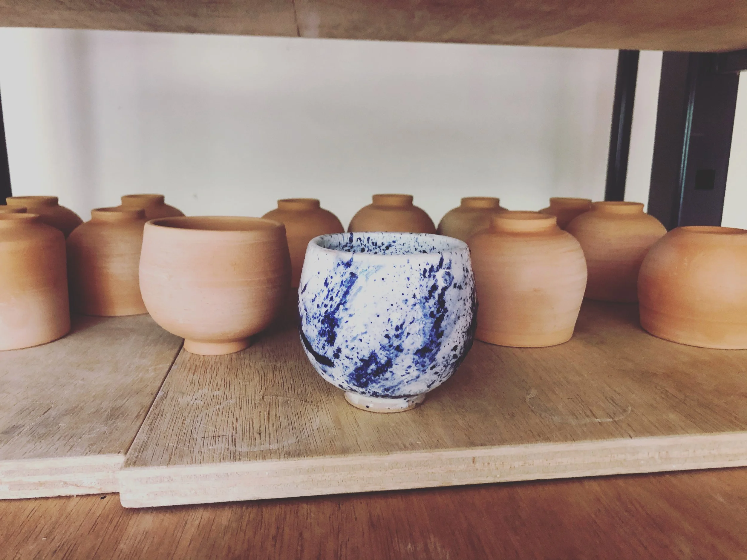 Shelf with terracotta clay pots and a white ceramic cup with blue splashes